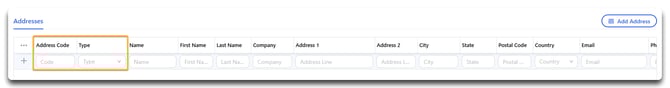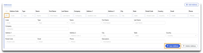 Addresses is for additional address information (e.g., if billing and shipping are different, if a vendor has multiple warehouses, etc.). Each address must be assigned an Address Code and a Type. Click the plus sign on the left to expand the address information. Click the minus sign to collapse it. See below for the expanded view.