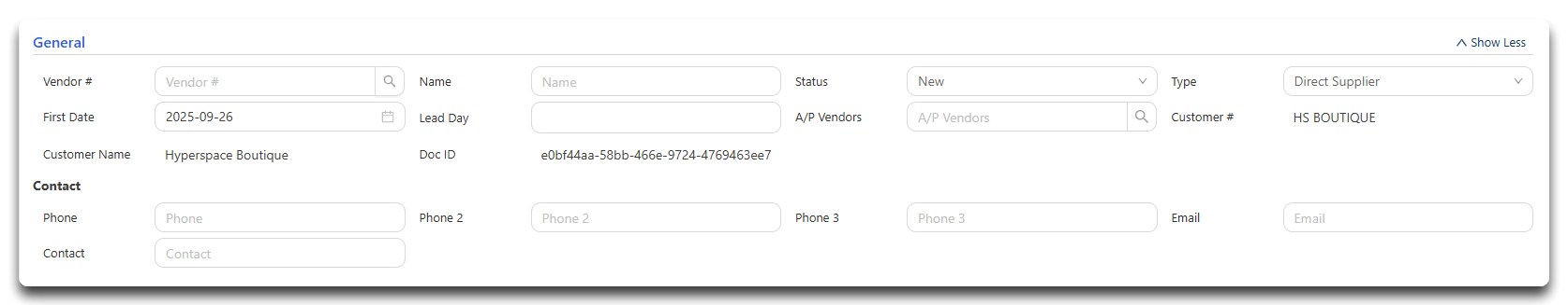 Warning: If the Vendor # field is left blank, DB will assign a sequence number to that vendor that you can use going forward. We highly recommend against this as the sequence number will be hard to recognize going forward.
