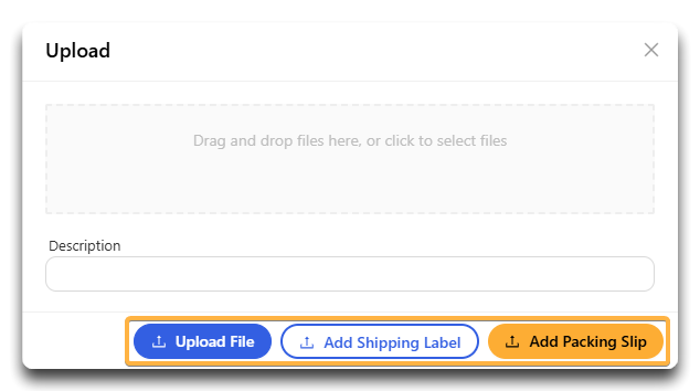 - Click Upload File for a miscellaneous attachment, Add Shipping Label if the file you've loaded is a shipping label, or Add Packing Slip if the file you've loaded is a packing slip. Supported formats include: