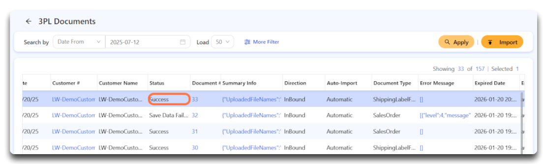 If status = Success, proceed to order verification (see next guide: How do I verify 3PL shipping label attachments in my orders?).
