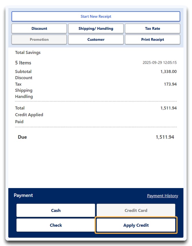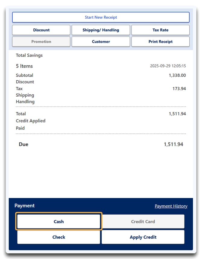 Note: You can always click Start New Receipt to begin a new transaction. Your current transaction will be saved as Incomplete.