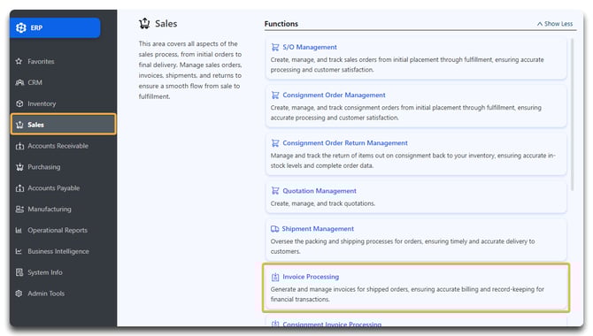 Sales > Invoice Processing.