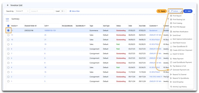 Click Apply (or search for the invoice in question) and select it. Then click Action > Generate Payment Link.