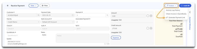 Users can generate payment links through two main workflows: from the Invoice List screen or while Receiving Payment. Each method leads to the same result—a shareable payment portal link for the customer—but they are accessed in slightly different places.