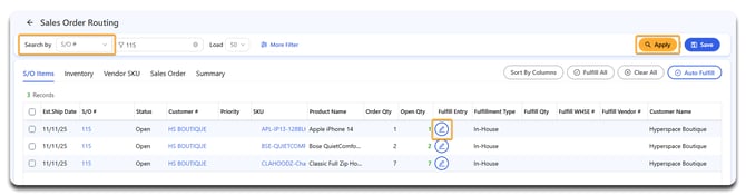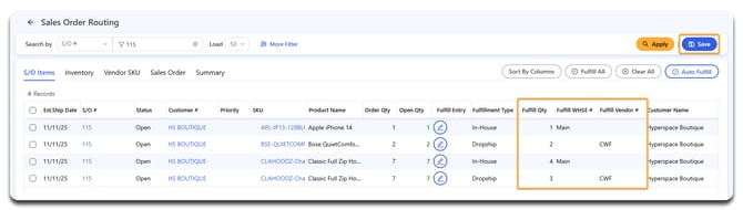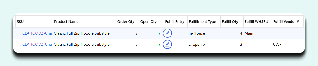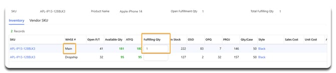 After allocating SKUs, you’ll see values appear in Fulfill Qty, Fulfill WHSE (in-house), or Fulfill Vendor (dropship) columns.