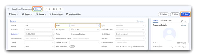 Note: If you’ve tagged your split orders with a “Split” tag, you can bulk update their status directly from the Sales Order List screen: select all Split-tagged orders → Action > Bulk Update → toggle on S/O Status → set to Open → click Save → click Apply after a few seconds to refresh.