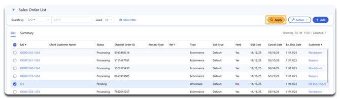 Click Apply to view all, or use Search By or More Filter to locate specific orders.