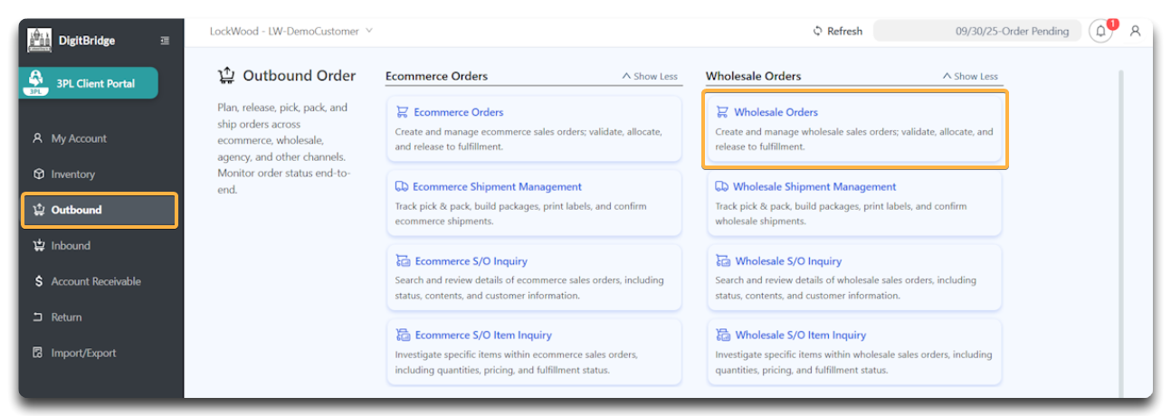 - In the main navigation, click Outbound > Wholesale Orders.