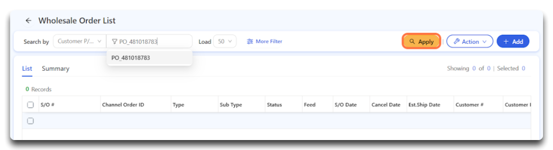 | 2 | Search by Customer P/O | Find the correct order |