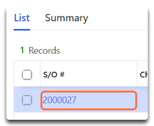 - Once the order appears, click the S/O # link to open the order details page.
